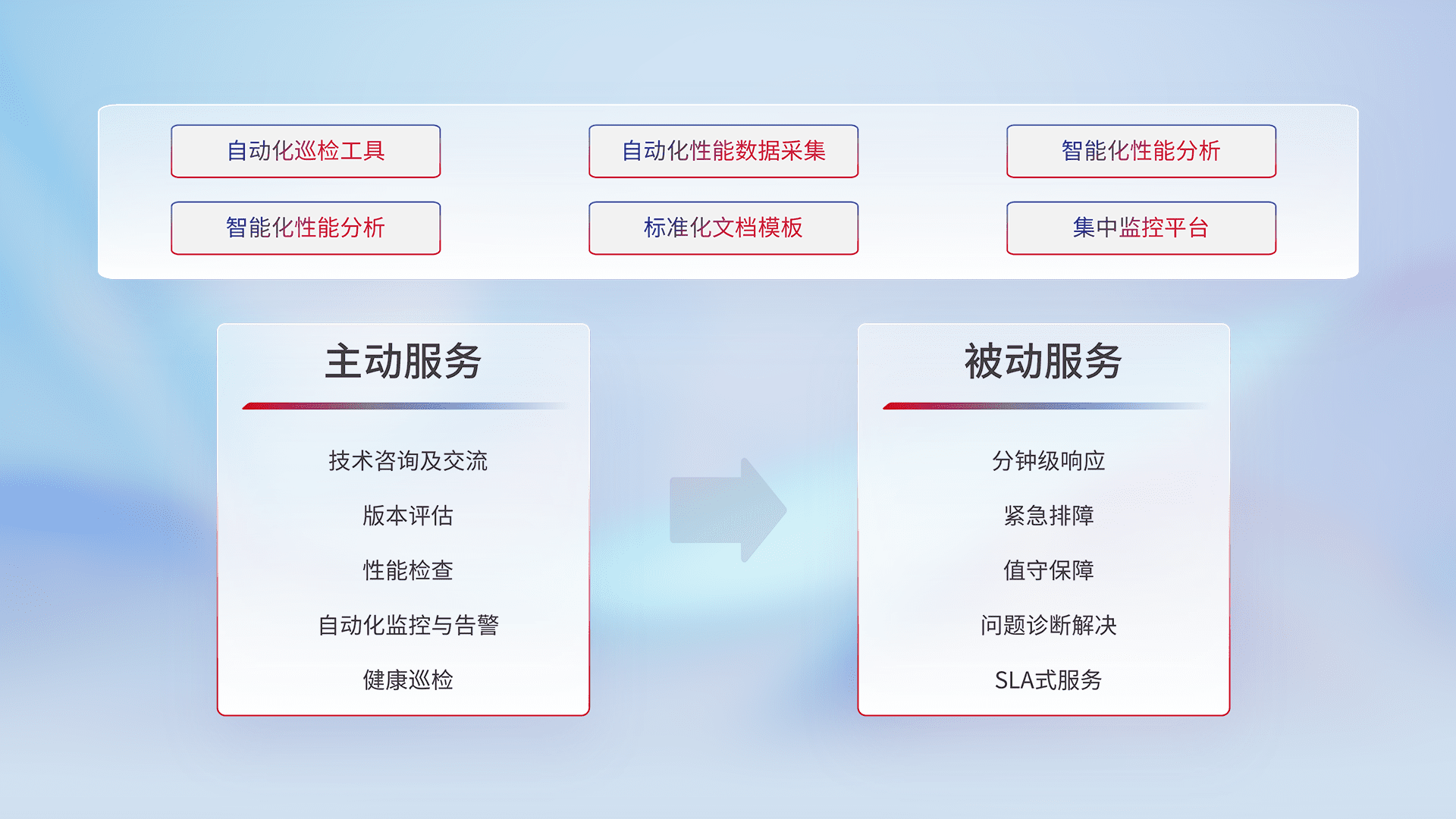智能化工具和标准化文档,,,保障服务质量,,,,提供主动服务(包含技术咨询、、版本评估、、、性能检查、、、、自动化监控与告警、、、、健康巡检)和被动服务包含(分钟级响应、、、紧急排障、、、、值守保障、、、问题诊断解决、、、SLA服务)。。。